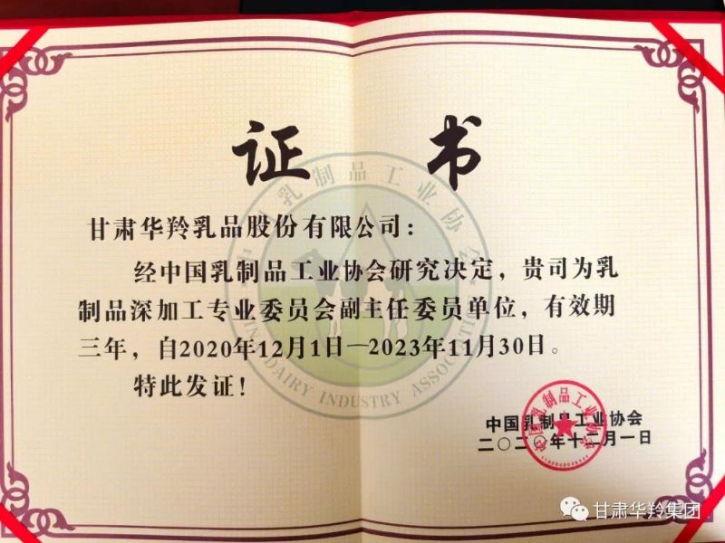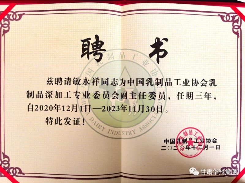 在乳制品深加工產(chǎn)品科學(xué)發(fā)展論壇暨乳制品深加工專業(yè)委員會(huì)成立大會(huì)上,甘肅華羚乳品股份有限公司被中國(guó)乳制品工業(yè)協(xié)會(huì)乳制品深加工專業(yè)委員會(huì)聘為副主任委員單位,甘肅華羚乳品股份有限公司董事長(zhǎng)敏永祥受聘為中國(guó)乳制品工業(yè)協(xié)會(huì)乳制品深加工專業(yè)委員會(huì)副主任委員。